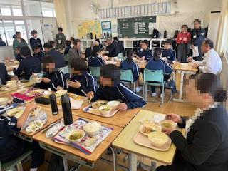 淡路市産100%給食が実施され、市議会議員、教育委員、給食センター、栄養教諭等が来校し、市の広報課や神戸新聞社も取材に訪れました。多くの方が1年2組の生徒たちと一緒に、配食されたお皿を取りに行き、机を班にして和やかに談笑しながらいただきました。人気メニューばかりでしたので、見事完食!!💪