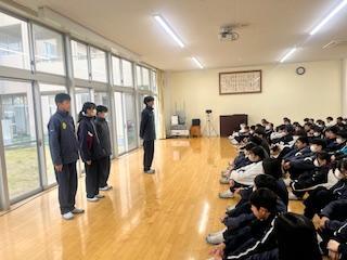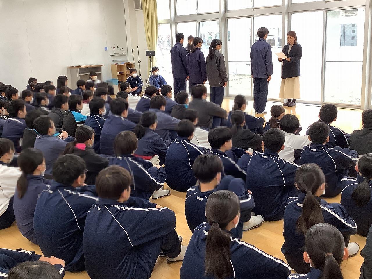 2月は学年閉鎖や学級閉鎖が相次ぎ、感染症対策として全校集会は開催できませんでした。3月の全校集会は今年度最後となり、校長講話で1年を振り返りお話ししました。【以下、抜粋要約】この一年、楽しく充実した時間もたくさんありましたが、一方でつらく苦しいしんどい思いをした人もいたのではないでしょうか。しかし、その苦しいことやしんどいことに、自分のすべてを支配されないようにしてほしいです。いいことばかりも嫌なことばかりも、永遠に続くことはありません。今、しんどくて苦しい人も、自分のすべてを支配されずに小さな幸せを見つけながら、どうか困難を乗り越えてほしい、、、春は別れと出会いの季節です。ワクワク期待しながら楽しみましょう!